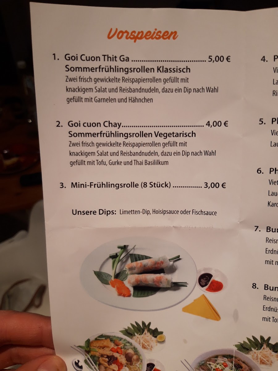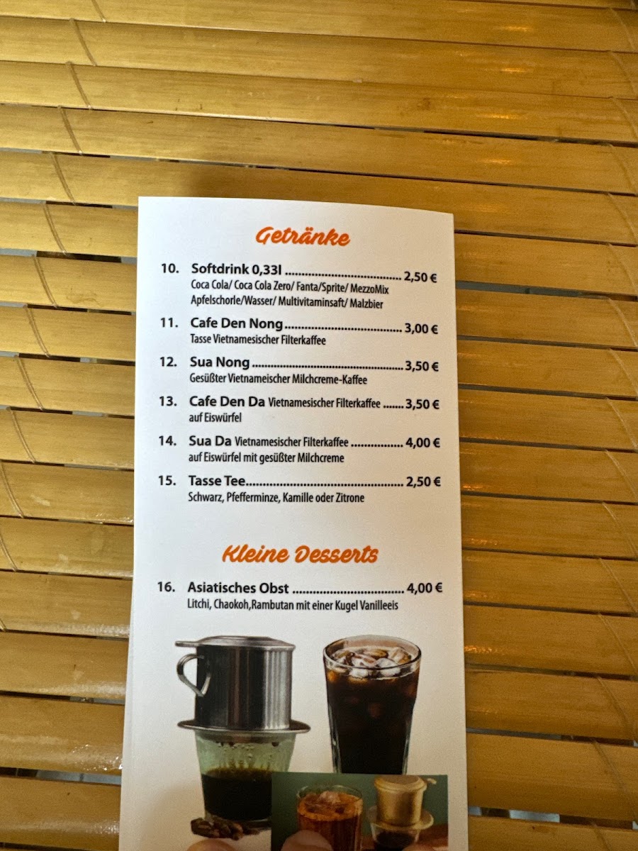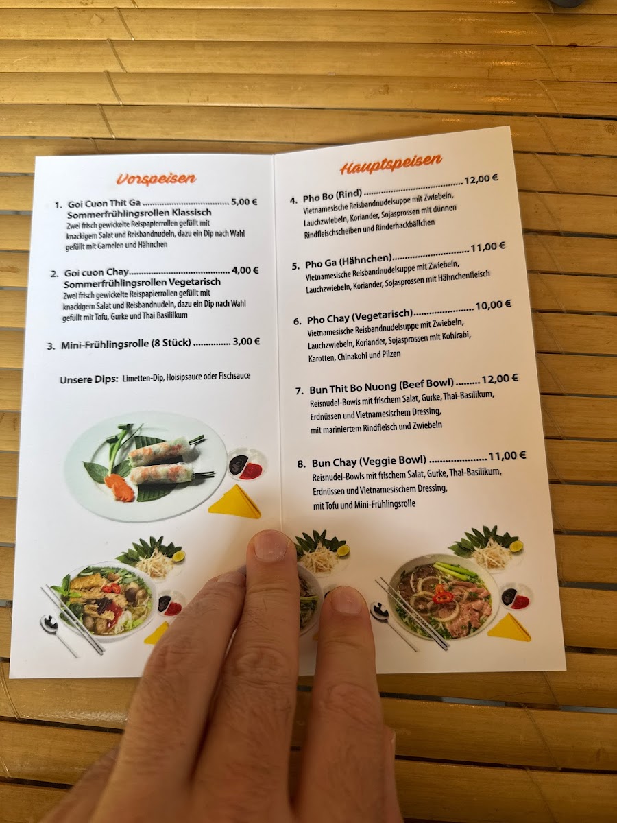 While the menu centers around classic offerings like Pho Bo (beef pho) and Bowl Mit Rind (beef noodle bowl), you can also find simple bites such as fresh Frühlingsrollen that complement the savory soups. These choices reflect a straightforward, authentic approach, suited to enjoying a calm meal with friends or quietly unwinding solo.